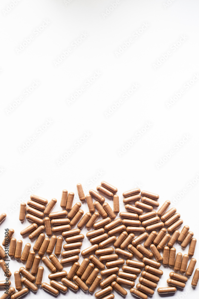 Texture. Dietary supplements for health and immunity. Vitamins and supplements.On white background. Space for text