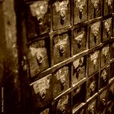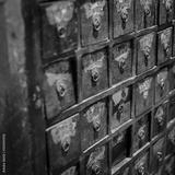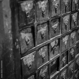 Chinese vintage pharmacy cabinet as background black-white photo.
