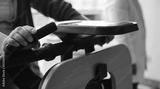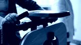 Exercise bike in medical practice. Close-up user hands.