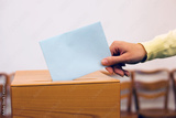 Frau bei Wahl mit Stimmzettel und Wahlurne