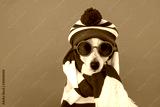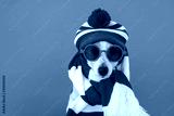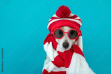Dog wearing red sunglasses, knitted hat and scarf sitting and looking at camera isolated on blue background