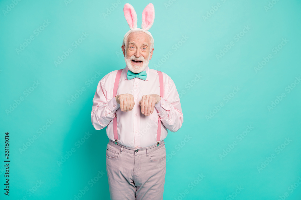 Portrait of amazed excited old man enjoy easter event party imagine he funny funky rabbit fooling with his grandchildren wear pink grey pants trousers isolated over teal color background