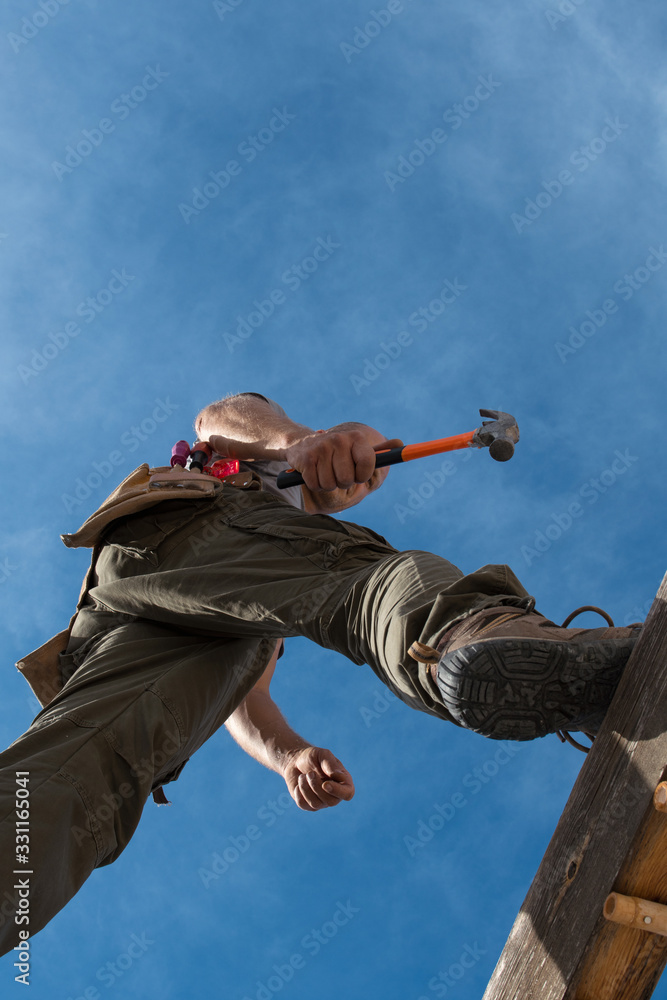 Soft focus construction worker repairing house.
