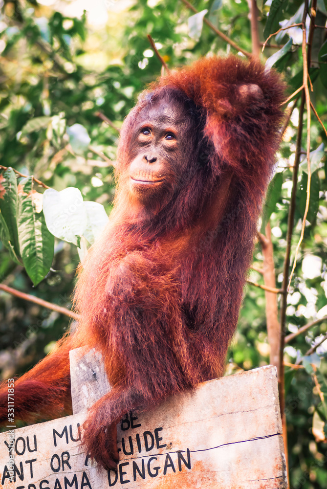 Orangutan sitting and touching his head thinking