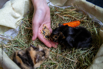 Feed carrots to baby Guinea pigs. Hold the baby Guinea pig in your hands. Rodents in the apartment, at home. Care of Pets.