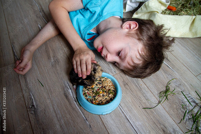 Baby Guinea pigs try the first meal. Proper nutrition of Pets, care of rodents.