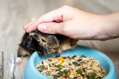Baby Guinea pigs try the first meal. Proper nutrition of Pets, care of rodents.
