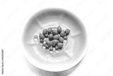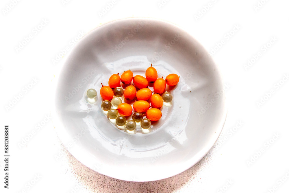 Sea buckthorn berries and vitamins on plates. Choose between natural and artificial. Alternative, replacement of chemical ingredients.