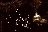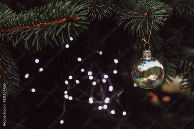 The Christmas tree is decorated with a white garland with bulbs, a ball. Copy space. Glare, light, on the Christmas tree. Beautiful background of natural spruce. Dark, old tinted.