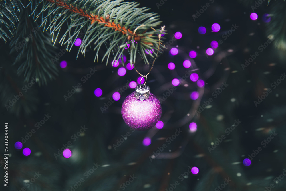 The tree is decorated for Christmas with a purple garland with bulbs, a ball. Copy space. Glare, light, on the Christmas tree. Beautiful background of natural spruce.