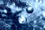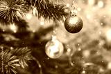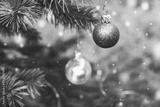 Horizontal background. The Christmas tree is decorated with a ball and a garland with bulbs. Copy space. Black and white background.
