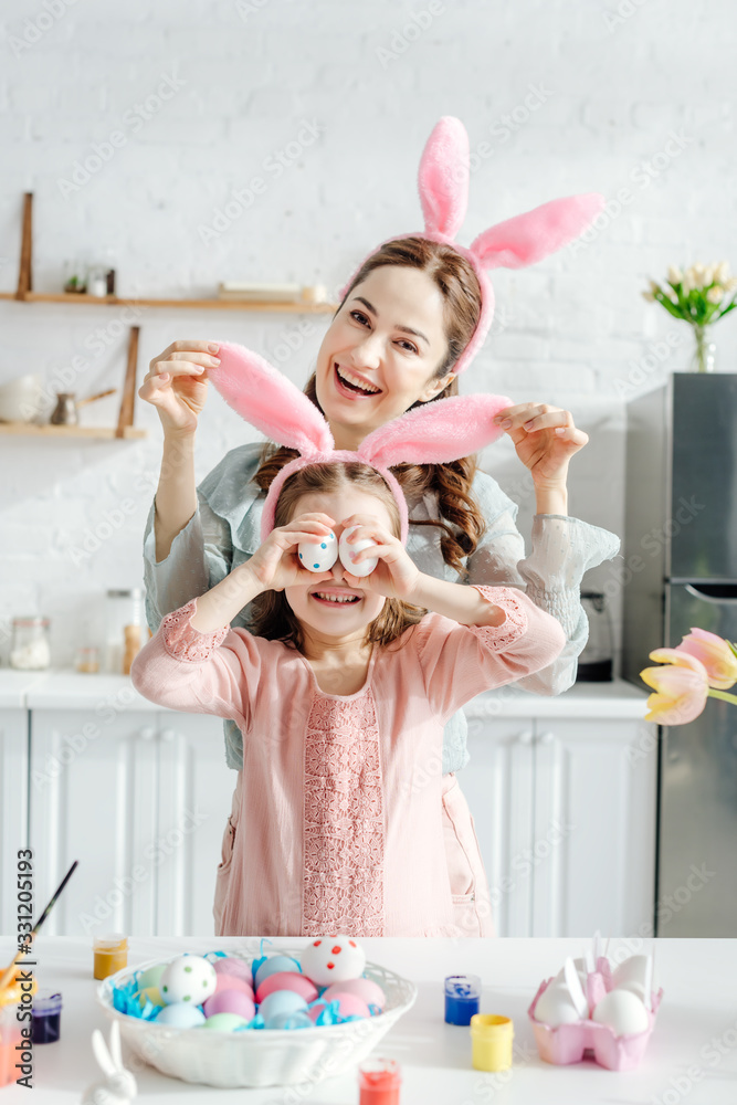 Happy mother touching bunny ears on daughter covering eyes with chicken eggs near tulips