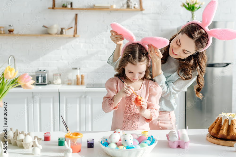 selective focus of happy mother touching bunny ears on daughter painting chicken egg near easter bread