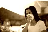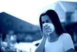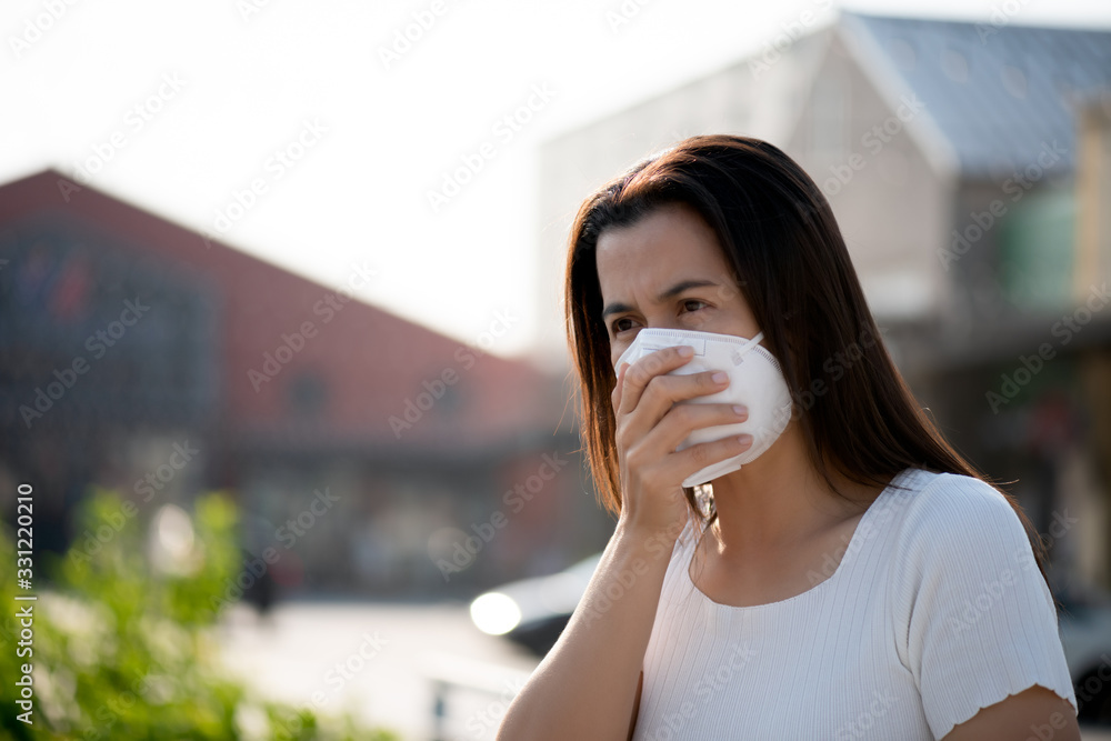 Close up of a woman in a suit wearing Protective face mask and cough, get ready for Coronavirus and pm 2.5 fighting against beside road in background.