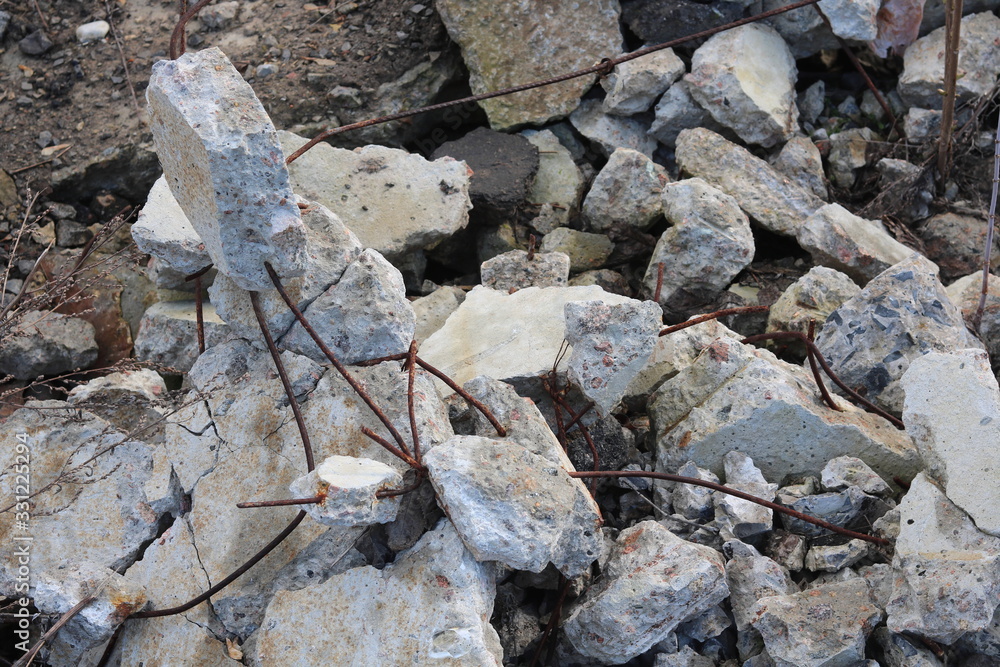 Construction waste with elements of and destroyed old structures at municipal landfill