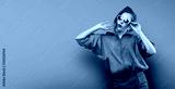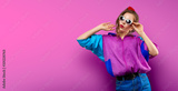 Cool teenager. Fashionable DJ girl in colorful trendy jacket and vintage retro sunglasses enjoys style of 80s � 90s vibes. Teenager Girl at disco party. Young fashion model on pink color background.