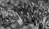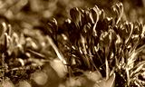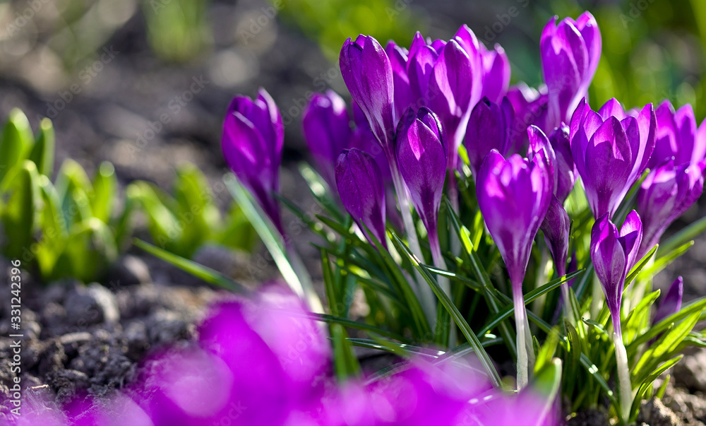 Crocus spring flowers in garden. Sunny time springtime day with sunshine light. Close-up. Shallow depth of field.