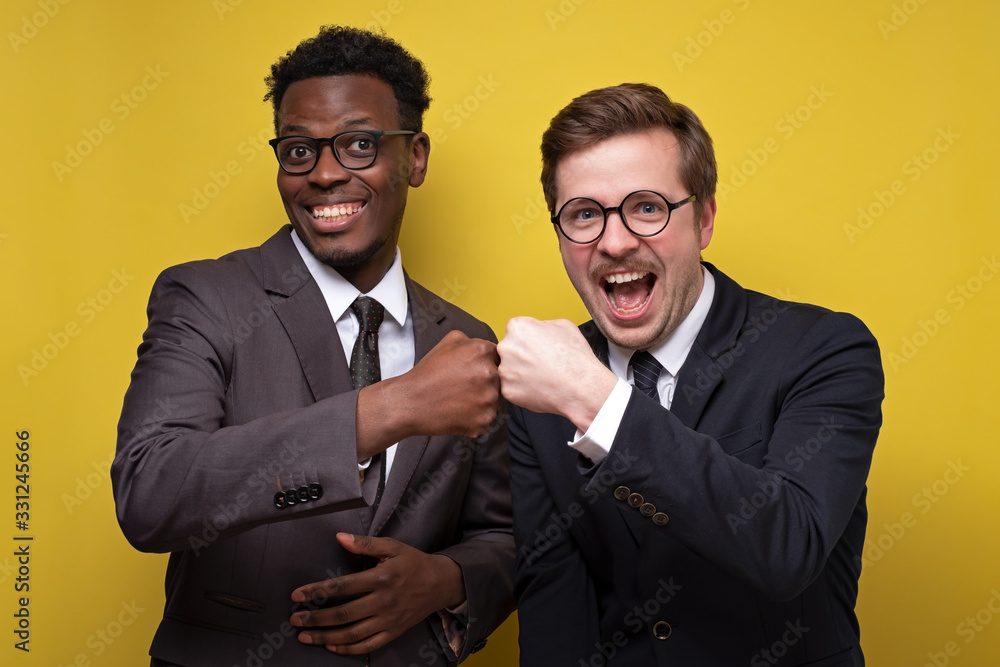 Two confident men in suit, african and caucasian guys making fist bumping
