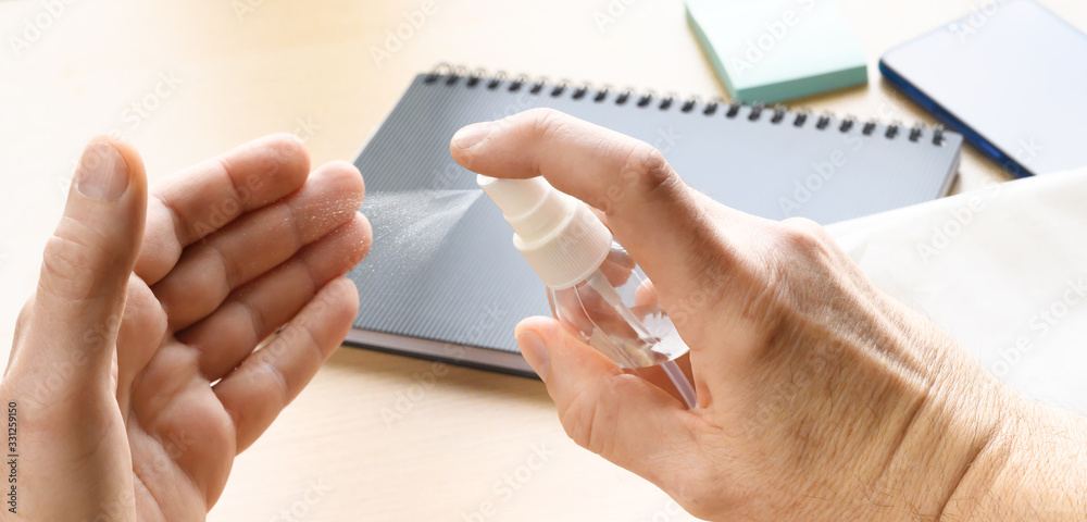 Man applying hand sanitizer spray on office desk background. Antiseptic liquid for cleaning and protecting hands from coronavirus.