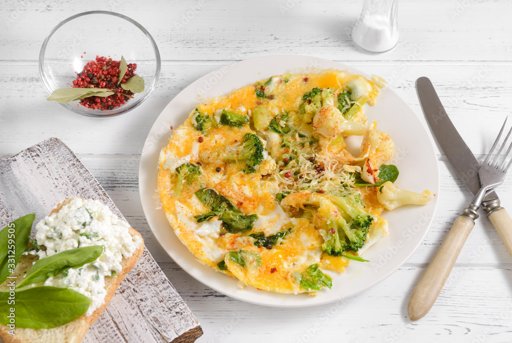 omelette with spinach and broccoli and cheese on a plate on a white wooden background, sandwich with soft cheese and greens
