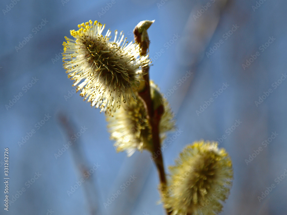 Nature awakes in spring. Blooming willow twigs and furry willow-catkins, so called "seals" or "cats". Palm Sunday. Holly willow (Salix caprea) is a national symbol of Ukraine. Blossoming pussy willow