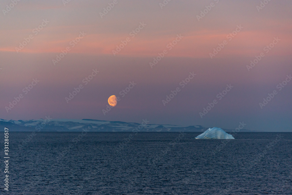 Beautiful moonrise in Greenland. Iceberg at sea.