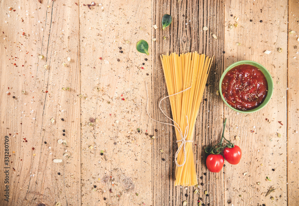 Uncooked spaghetti on wooden table . Topview of dried noodle