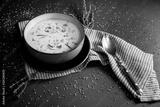 Delicious mushroom cream soup with champignons on the gray table