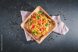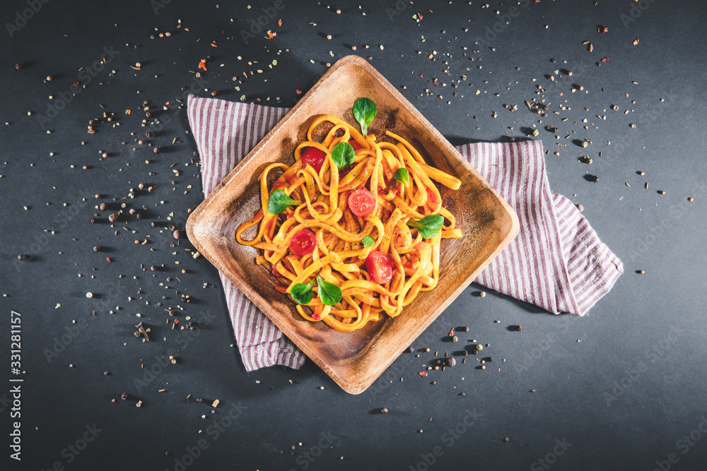 Pasta with tomato sauce and basil. Delicious tagliatelle. Italian tasty food