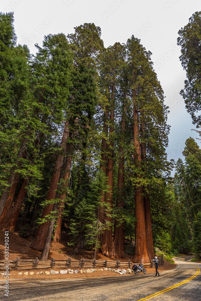 A man taking a picture of a giant redwood, growing along the Generals Highway, California, USA.