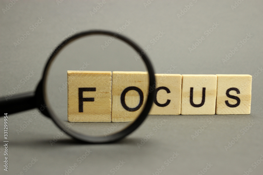 The word focus is made of wooden letters with a magnifying glass. Selective focus