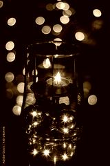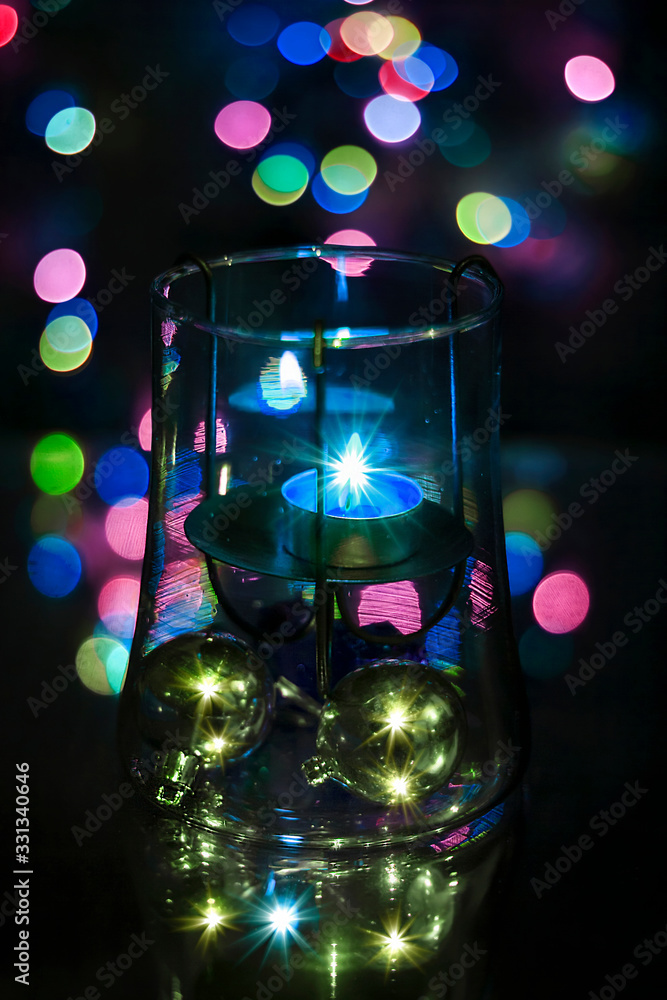 A candle glass holder in front of colorful christmas lights,on the glass table,close up