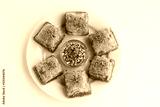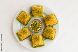 Traditional Turkish Pastry Dessert Baklava designed in round plate with pistachio nuts,with copy space.
