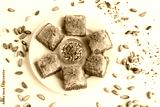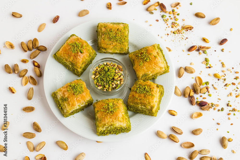 Traditional Turkish Pastry Dessert Baklava designed in round plate with pistachio nuts,with copy space.
