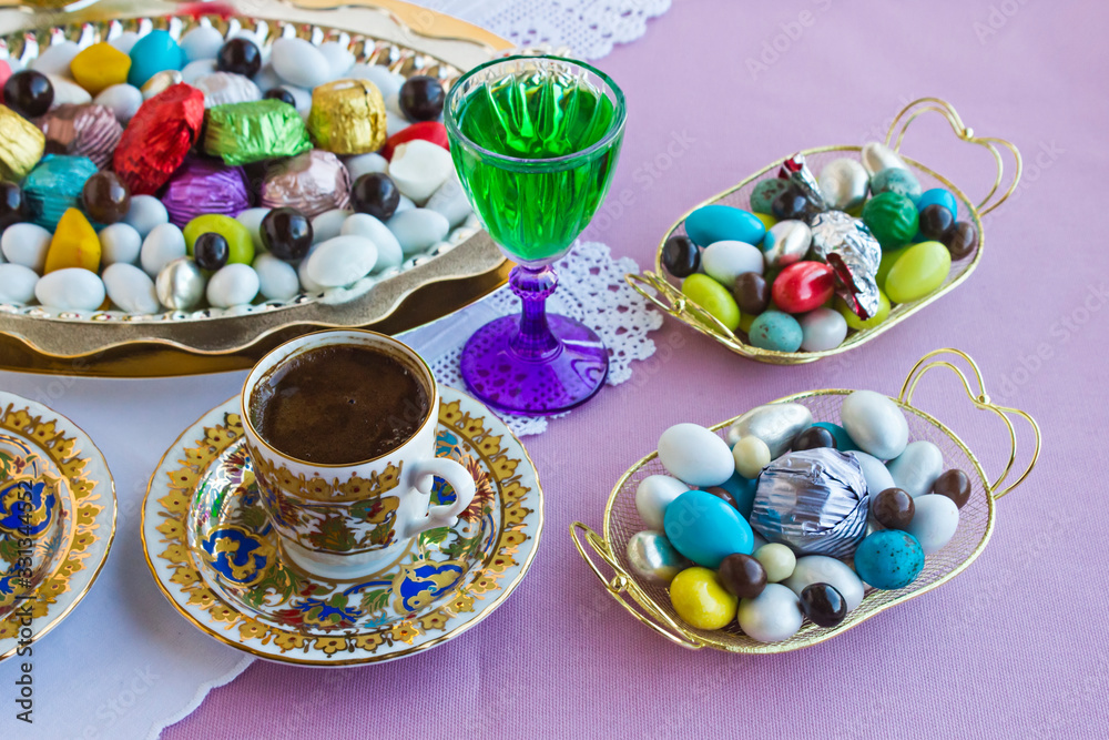 Luxury,Colorful,Traditional Turkish Hard Candies and Chocolates in the metal tray with Turkish Coffee and liqueur.Celebration table of any festival.