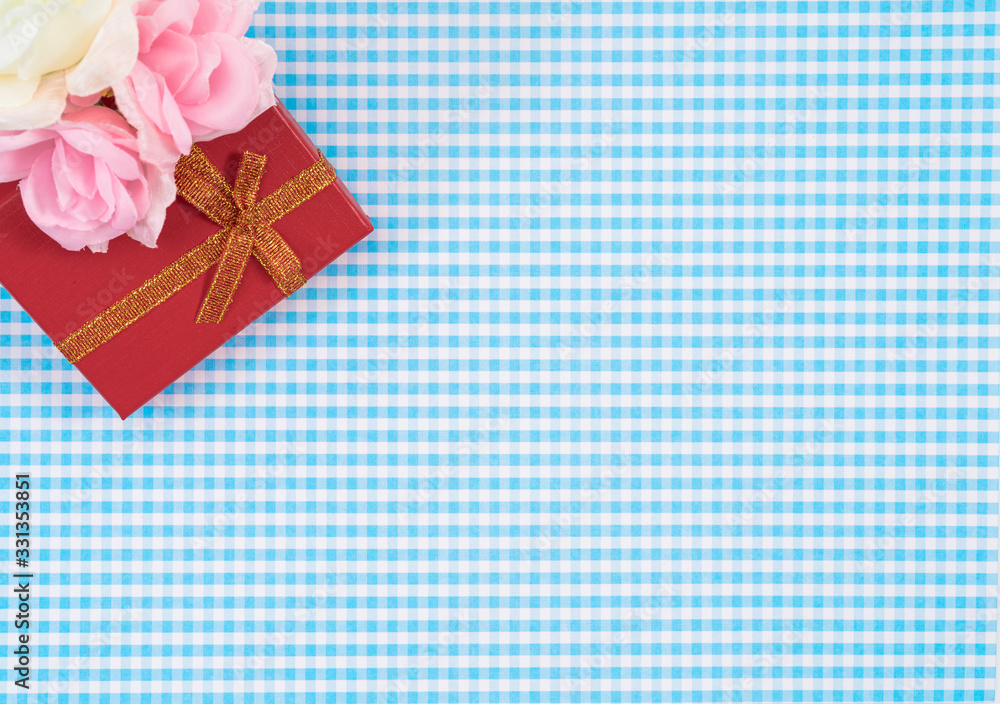 gift box with red isolated on Plaid background. Holiday decoration for Mother's Day or Women's Day.
