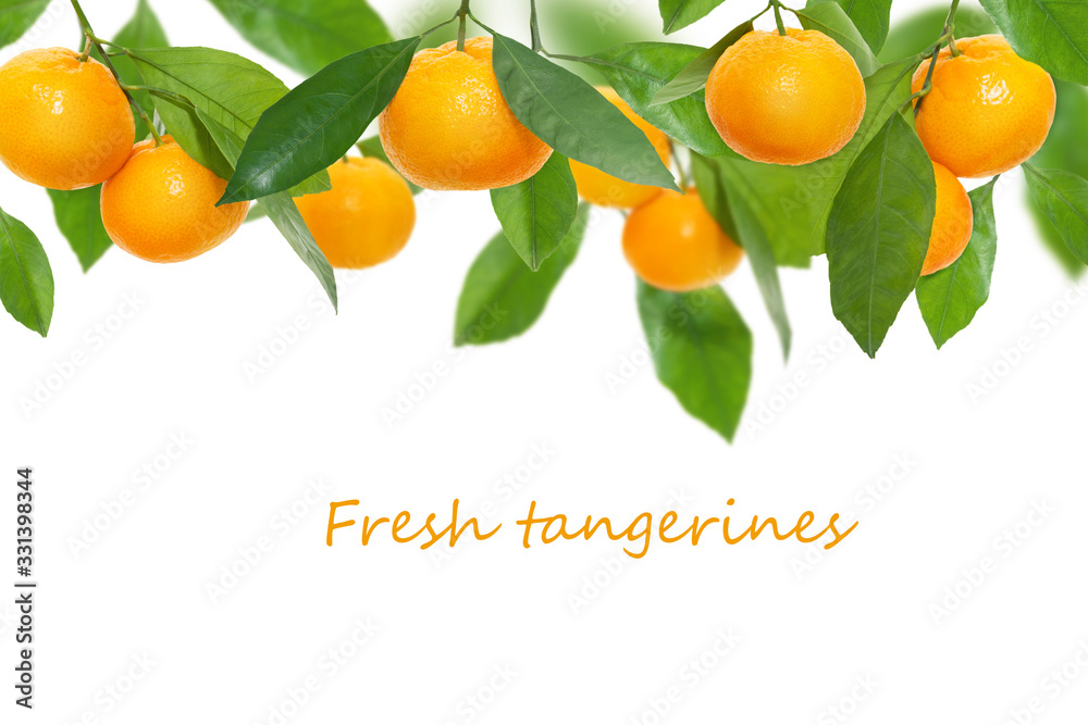 Fresh ripe tangerines with green leaves isolated on white background, copy space