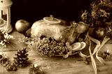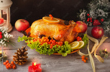 Cooked roasted Turkey with berries, vegetables and apples on wooden table background with black backdrop. Christmas or thanksgiving