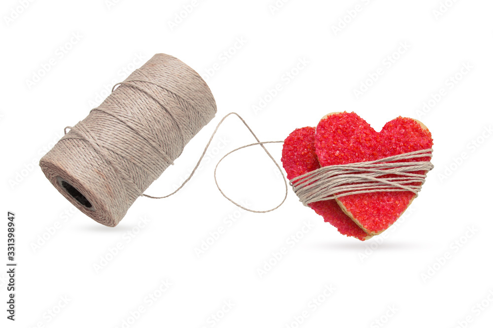 Two red heart cookies tied together with rope, isolated on white background, Valentines day