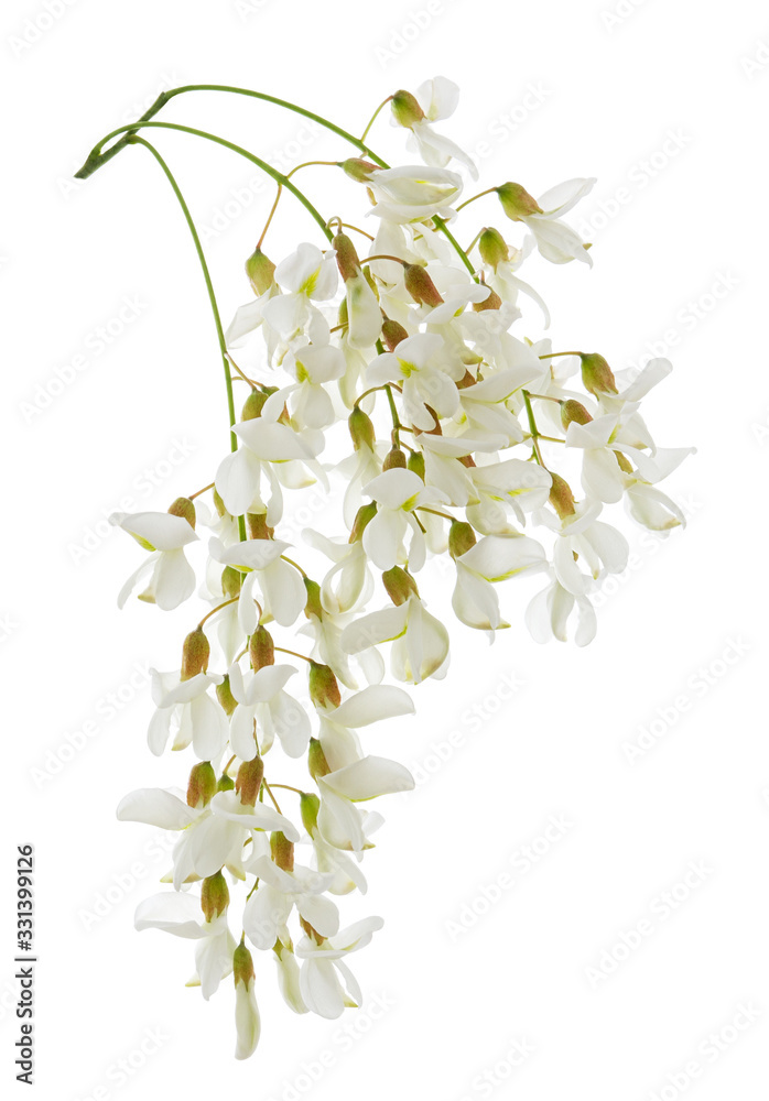 White spring flowering acacia flowers brush isolated on white background, honey plant