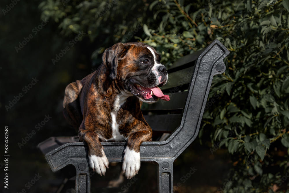 german boxer dog lying down on a bench