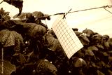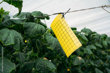 Cucumber plants growing in traditional greenhouse in Almeria. Integrated pest management technique at crops field. Yellow plaque pheromone glue traps