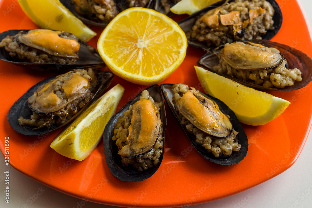 Traditional Turkish stuffed mussels on an orange porcelain plate with fresh lemon