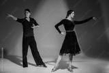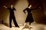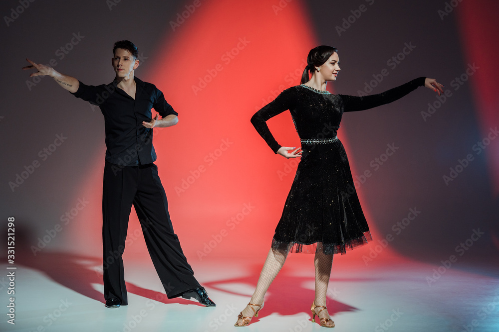 elegant young couple of ballroom dancers dancing in red light