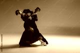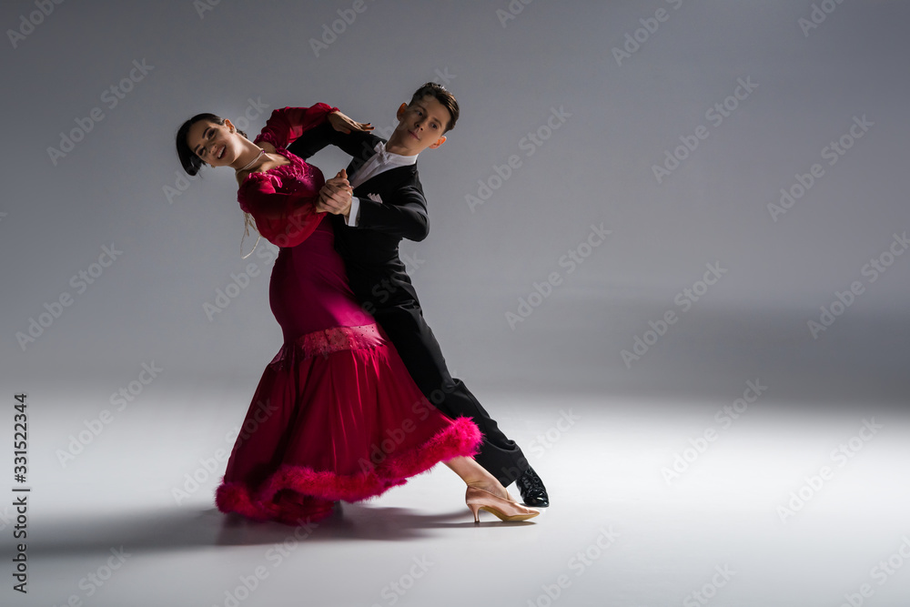 elegant young couple of ballroom dancers in red dress in suit dancing on grey
