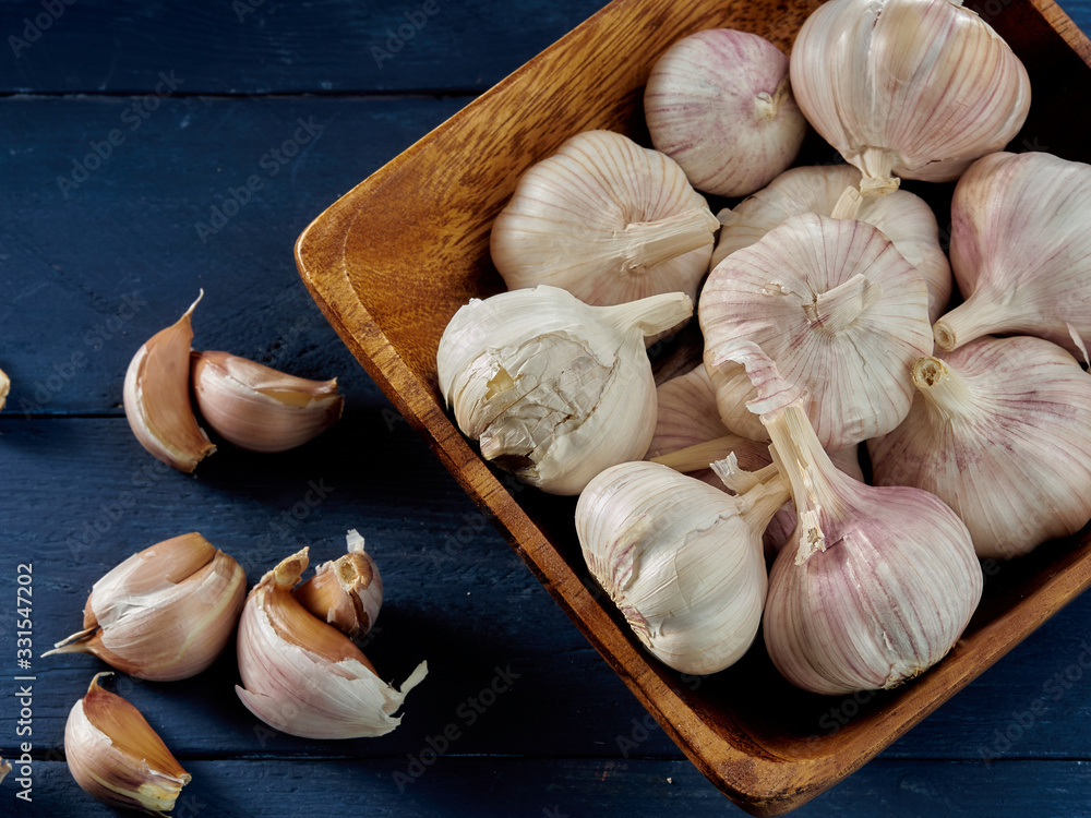 Ripe garlic lies on a wooden blue background.Healthy food.Spices