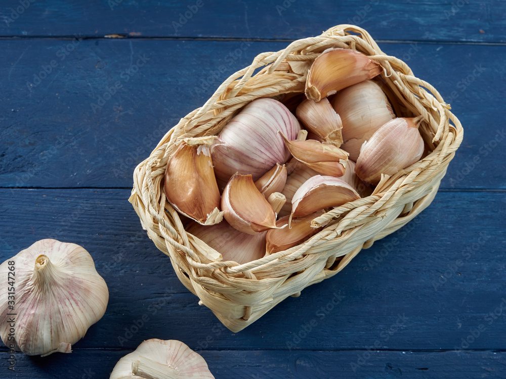 Ripe garlic lies on a wooden blue background.Healthy food.Spices