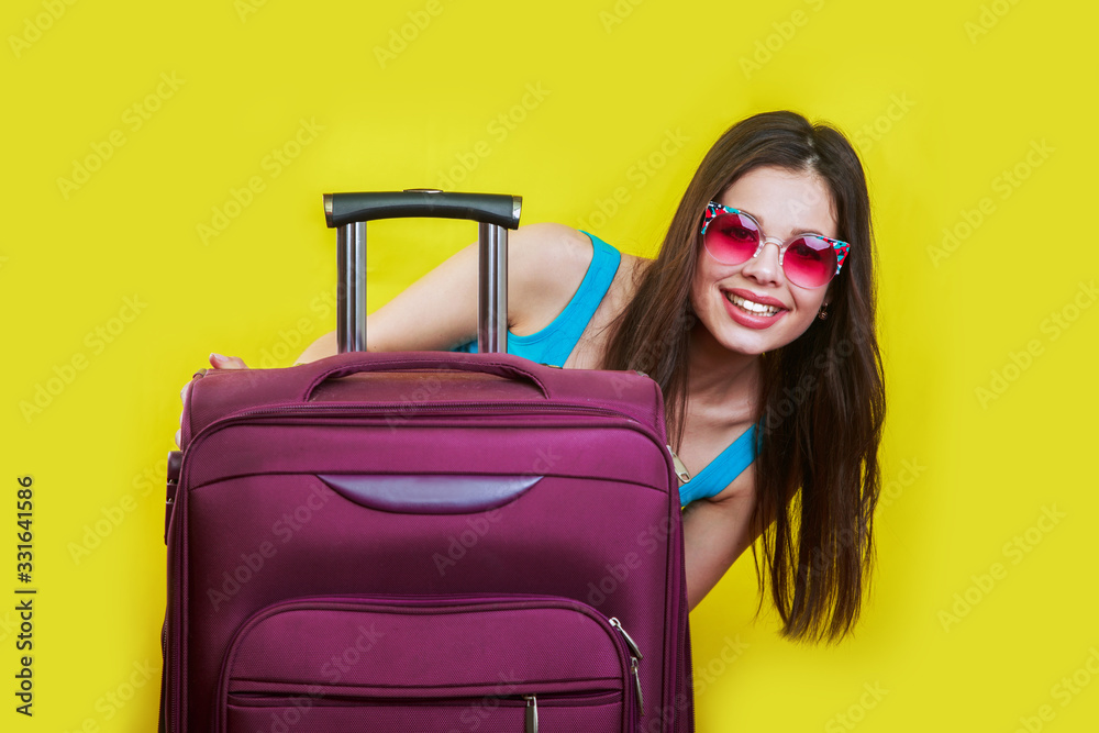 Happy excited woman with suitcase on summer vacation wearing trendy sunglasses on yellow background
