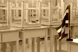 The national flag of Thailand on a student’s desk in an empty classroom with chairs tidied away on top of tables