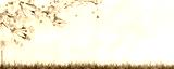 Pink cherry tree blossom flowers blooming above a green grass meadow on a spring Easter sunny day banner background.